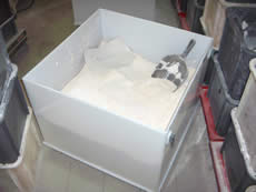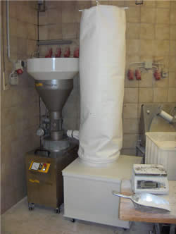 Vom oberen Rand geht es zentripedal, also entgegen der Fliehkraftwirkung, mit dem Luftstrom aus der Maschine und mündet in dem schon genannten Gefäß, wo das Mehl niederfällt, während die Luft durch die Filterfläche staubfrei austritt. Der in der Wirbelmühle kreisende und entgegen der Fliehkraftwirkung abgehende Luftstrom bewirkt unmittelbar auf der Mahlbahn eine laufende Kühlung und Sichtung.